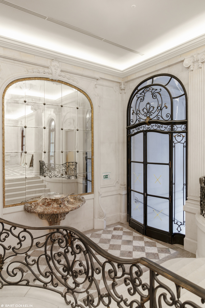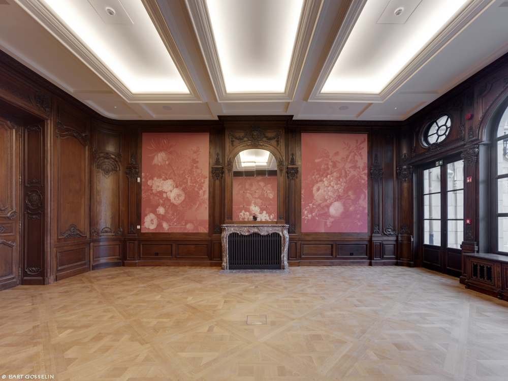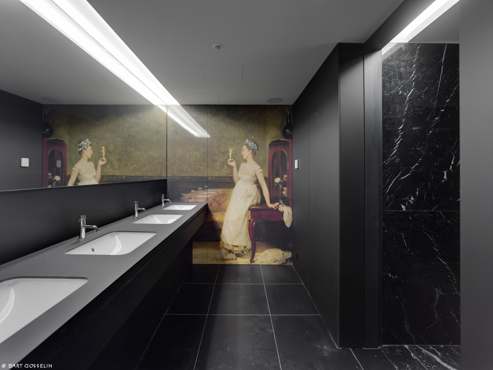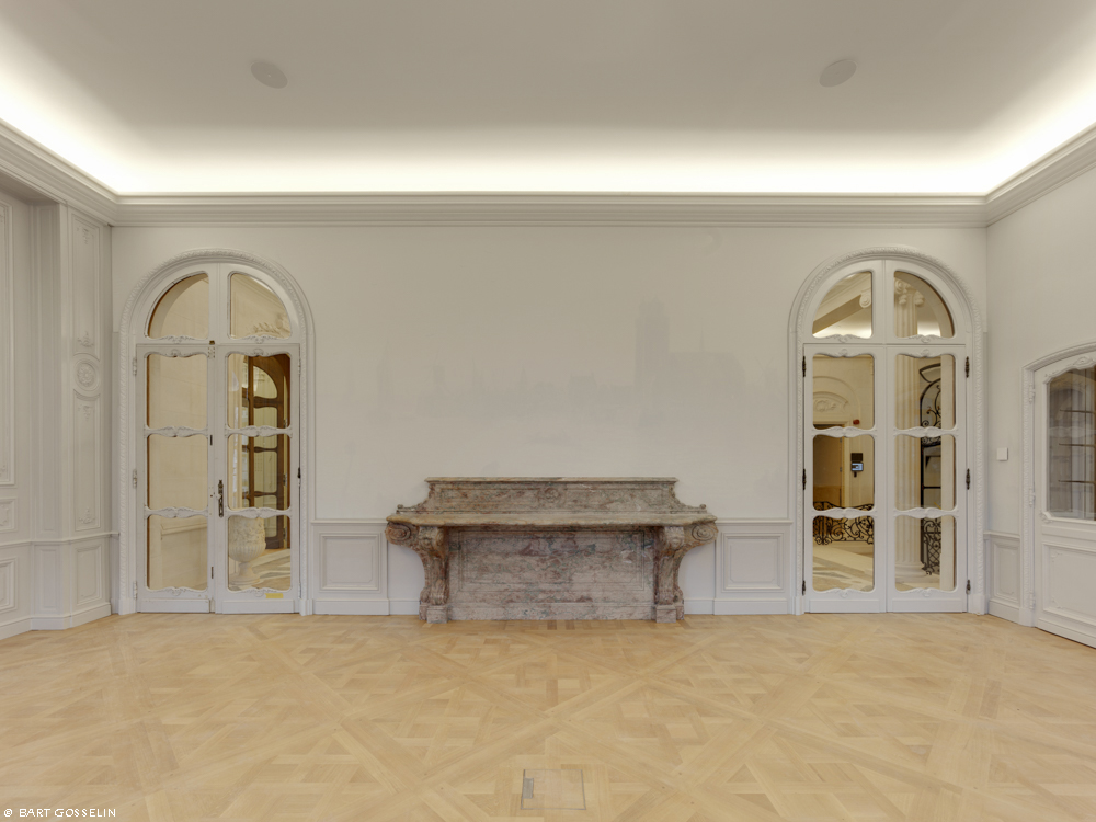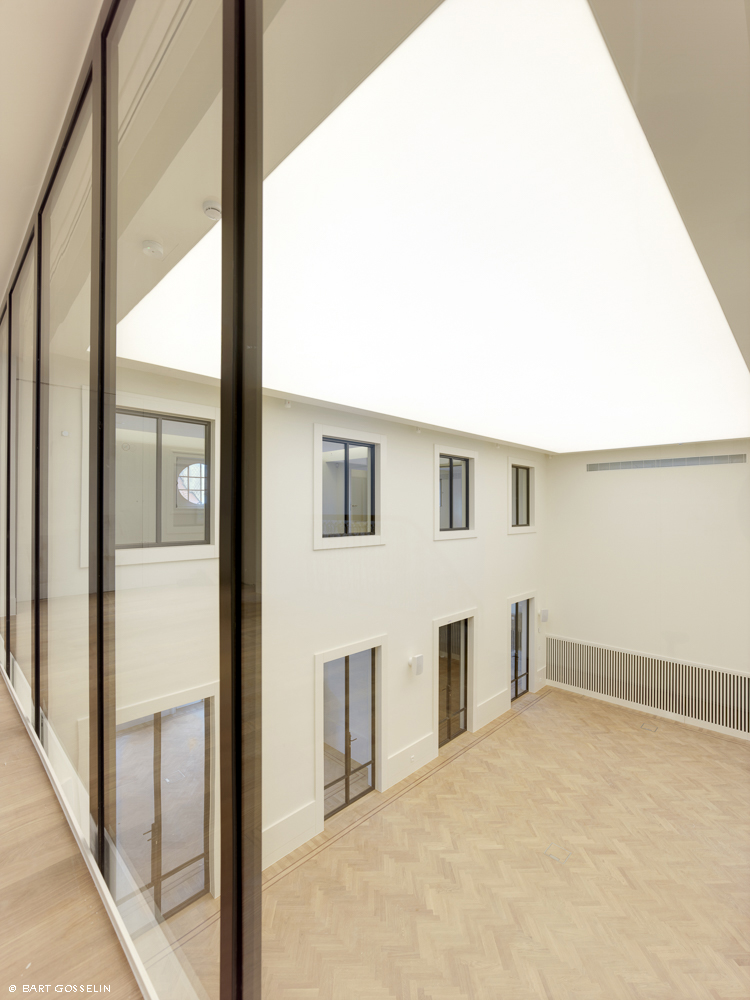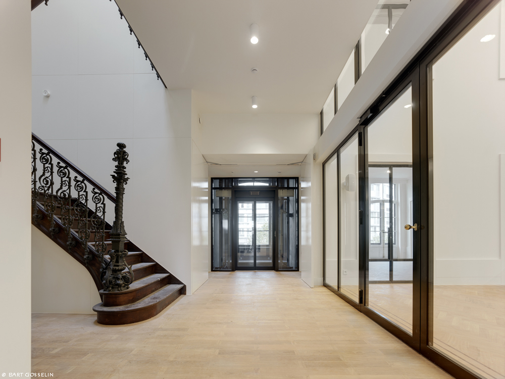 De historische interieurs werden gerestaureerd. Voor de overige ruimtes werd gekozen voor een hedendaags en integrerend herstel. Nieuwe toevoegingen in het gebouw zijn duidelijk herkenbaar maar refereren naar het historisch materiaalgebruik. Het nieuwe stalen binnenschrijnwerk rondom de dubbelhoge ruimte op verdieping 2 en 3 verwijst naar de bronzen voorzetramen. Nieuwe houten lambriseringen (latwerk) en parketvloeren refereren aan de historische salons op de eerste verdieping.